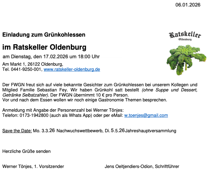 Wir bitten um Anmeldung bei unserem Schatzmeister und Gastgeber Uwe Küpker, Gästehaus Hankhausen unter Telefon: 04402 / 93 92 10